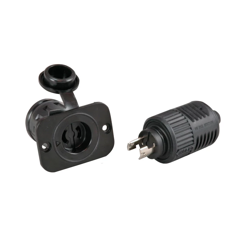 The patented Marinco ConnectPro Plug and Receptacle features unique locking blades with the industrys largest surface area for maximum surface contact and electrical conductivity. ConnectPro connections are weather resistant. The marine grade design includes corrosion resistant plated brass electrical components and a watertight sealing cap. The plugs ergonomic soft contoured grip allows easy hook up and blade alignment. An O ring seals out moisture while plugged into the receptacle.